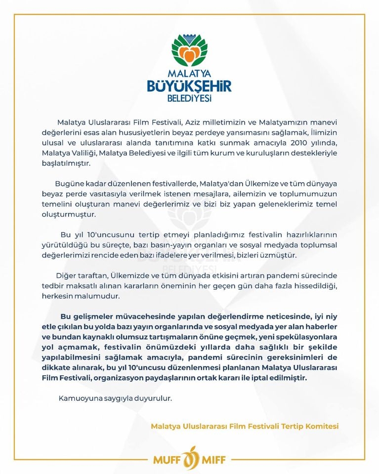 25 Kasım 2020 tarihine kadar Malatya Uluslararası Film Festivali Yönetim