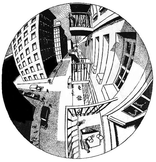 derecelik bir bölümü düzgün, kenarlara doğru bozulan bir perspektifle görür.